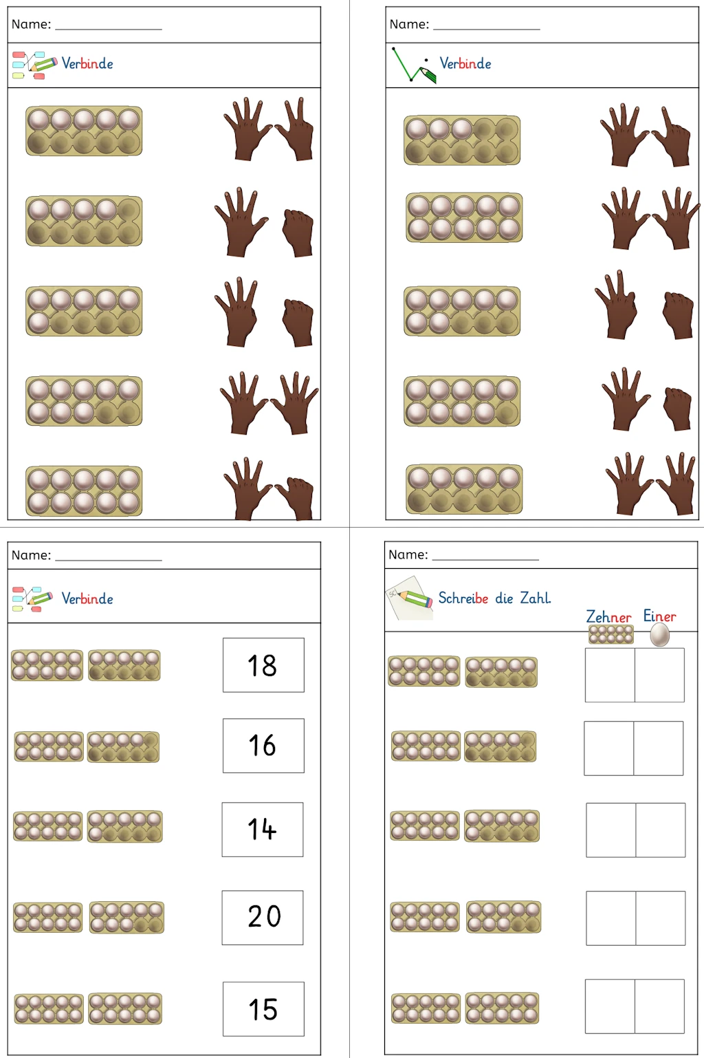 Ergänzend zum handelnden Packen der Eierkartons hier verschiedene Arbeitsblätter zum Verbinden der Menge mit dem Fingerbild oder der Zahl. Außerdem Arbeitsblätter zum Bündeln und Schreiben (Zehner und Einer). Erstellt mit dem Worksheet Crafter