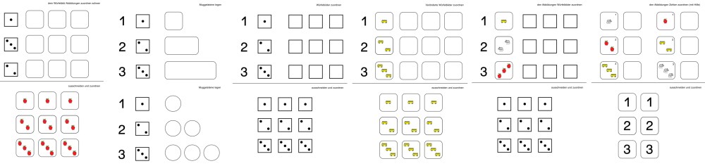 Material zur Erstellung von laminierten Klett-Arbeitsbögen zum Zuordnen von Menge-Menge sowie Zahl und Menge in verschiedenen Abstraktionsstufen im ZR 3.