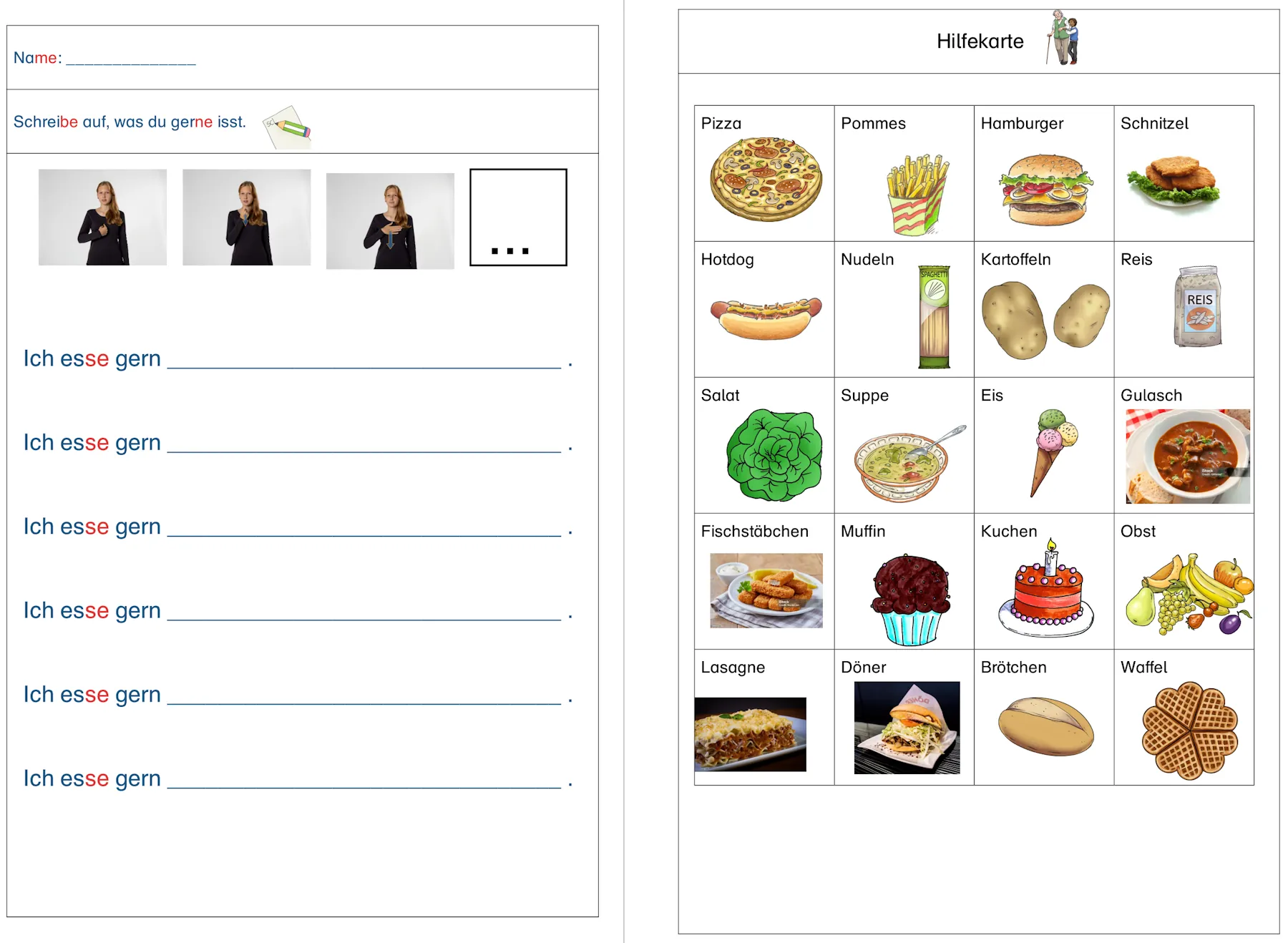 Die SuS sollen bis zu sechs Wörtern aufschreiben und dabei jeweils den Satz “Ich esse gern…” ergänzen. Sie können dabei frei aus dem Kopf schreiben oder auf die angefügte Hilfekarte zurückgreifen. Darauf ist eine Auswahl an Gerichten als Symbol/ Bild und dem passenden Schriftbild zum Auswählen und Abschreiben.