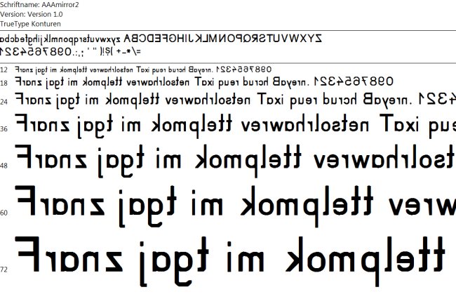 Bei der Schrift Mirror 2 von Ruben Rimmler (lesenrechnenschreiben.de) sind alle Buchstaben vertikal gespiegelt.