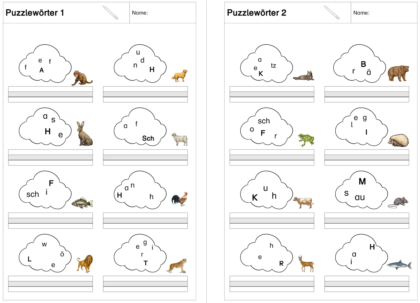 Finde heraus welches Tier gemeint ist und schreibe den Tiernamen unter die Wolke. Benuzte dafür die Buchstaben aus der Wolke. Erstellt mit dem Worksheet Crafter