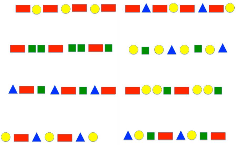 Die Reihen aus bunten Quadraten, Dreiecken, Kreisen, Rechtecken ausdrucken, laminieren und zerschneiden.