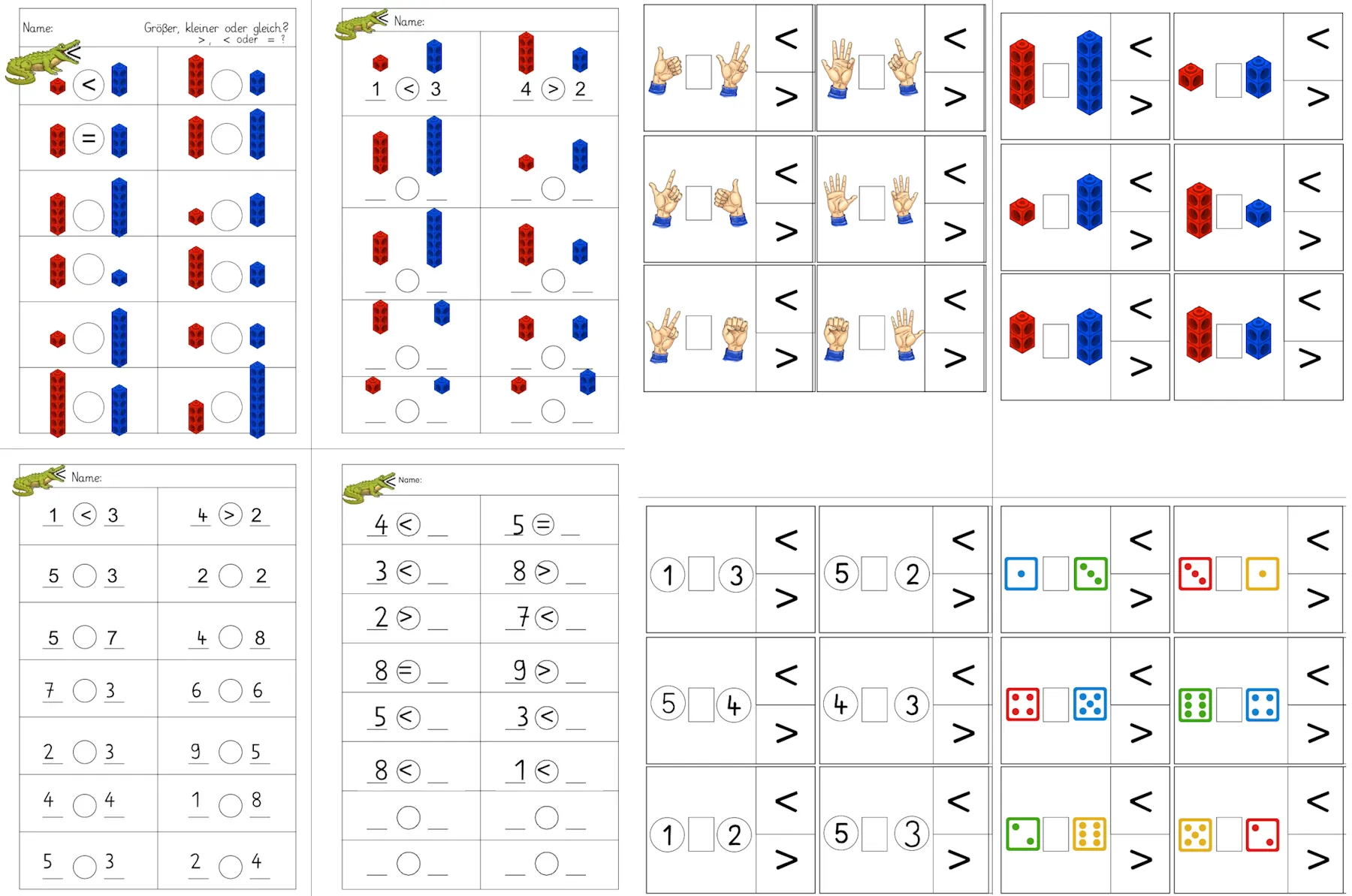 Arbeitsblätter zur Verwendung der Relationszeichen auf ikonischer und symbolischer Ebene üben, wobei Steckwürfel als Hilfsmaterial eingesetzt werden.