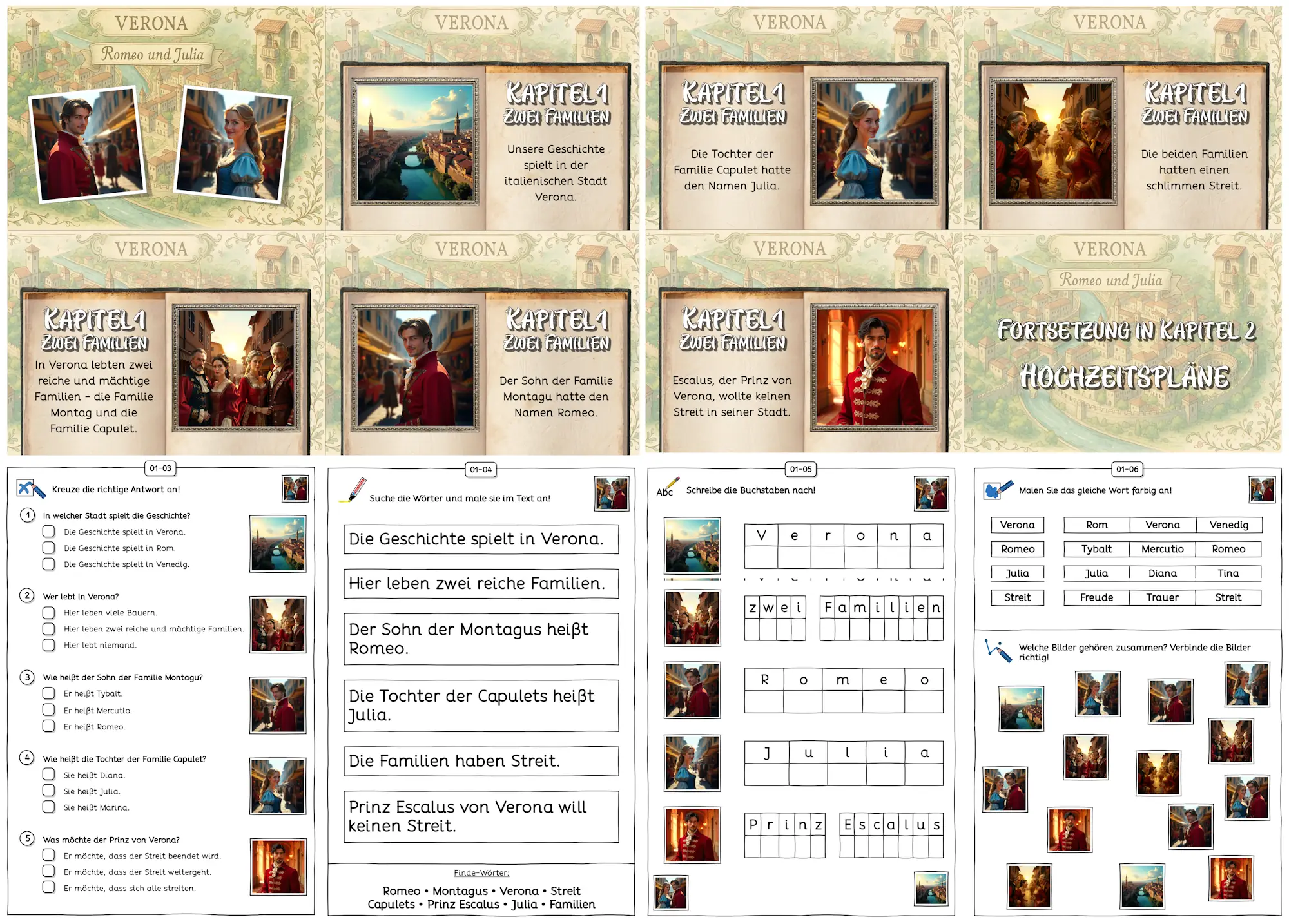 Dieses Paket enthält unsere Klassenlektüre “Romeo und Julia” von William Shakespeare in 10 Kapiteln, differenzierte Arbeitsblätter mit Infos zum Autor und den Figuren, Tafelposter mit Bildern der Hauptfiguren und eine Kurzzusammenfassung jedes Kapitels mit den entsprechenden Bildern.