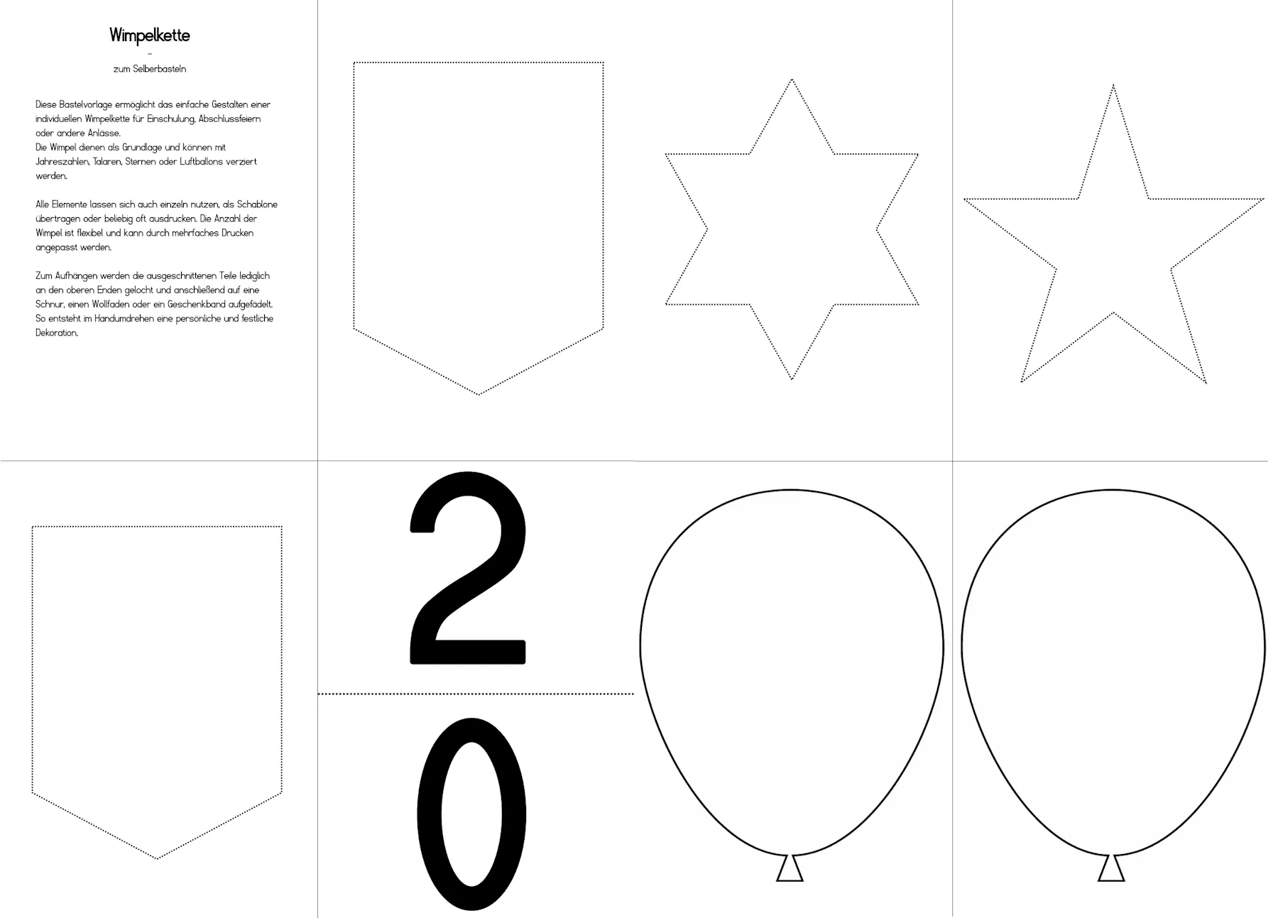 Diese Bastelvorlage ermöglicht das einfache Gestalten einer individuellen Wimpelkette für Einschulung, Abschlussfeiern oder andere Anlässe. Die Wimpel dienen als Grundlage und können mit Jahreszahlen, Talaren, Sternen oder Luftballons verziert werden. Alle Elemente lassen sich auch einzeln nutzen, als Schablone übertragen oder beliebig oft ausdrucken. Die Anzahl der Wimpel ist flexibel und kann durch mehrfaches Drucken angepasst werden. Zum Aufhängen werden die ausgeschnittenen Teile lediglich an den oberen Enden gelocht und anschließend auf eine Schnur, einen Wollfaden oder ein Geschenkband aufgefädelt. So entsteht im Handumdrehen eine persönliche und festliche Dekoration.