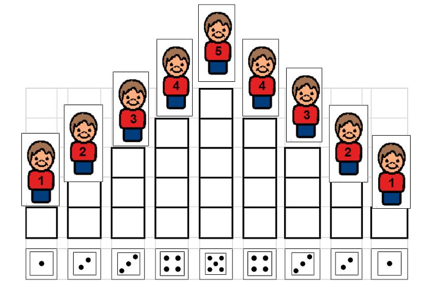 Mit Klettband können den einzelnen Stufen Zahlenmännchen und Würfelbilder zugeordnet werden. Das Bildmaterial stammt von sclera.be, straight-street.com und catedu.es/arasaac. Gefunden mit dem Picto Selector